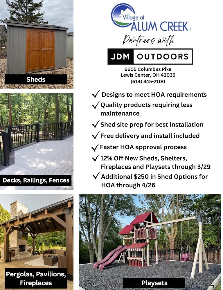 JDM has partnered with Village of Alum Creek HOA to offer you exclusive discounts. See attached to take advantage of this special opportunity. Thanks to our VGL rep Jen for securing this offer.